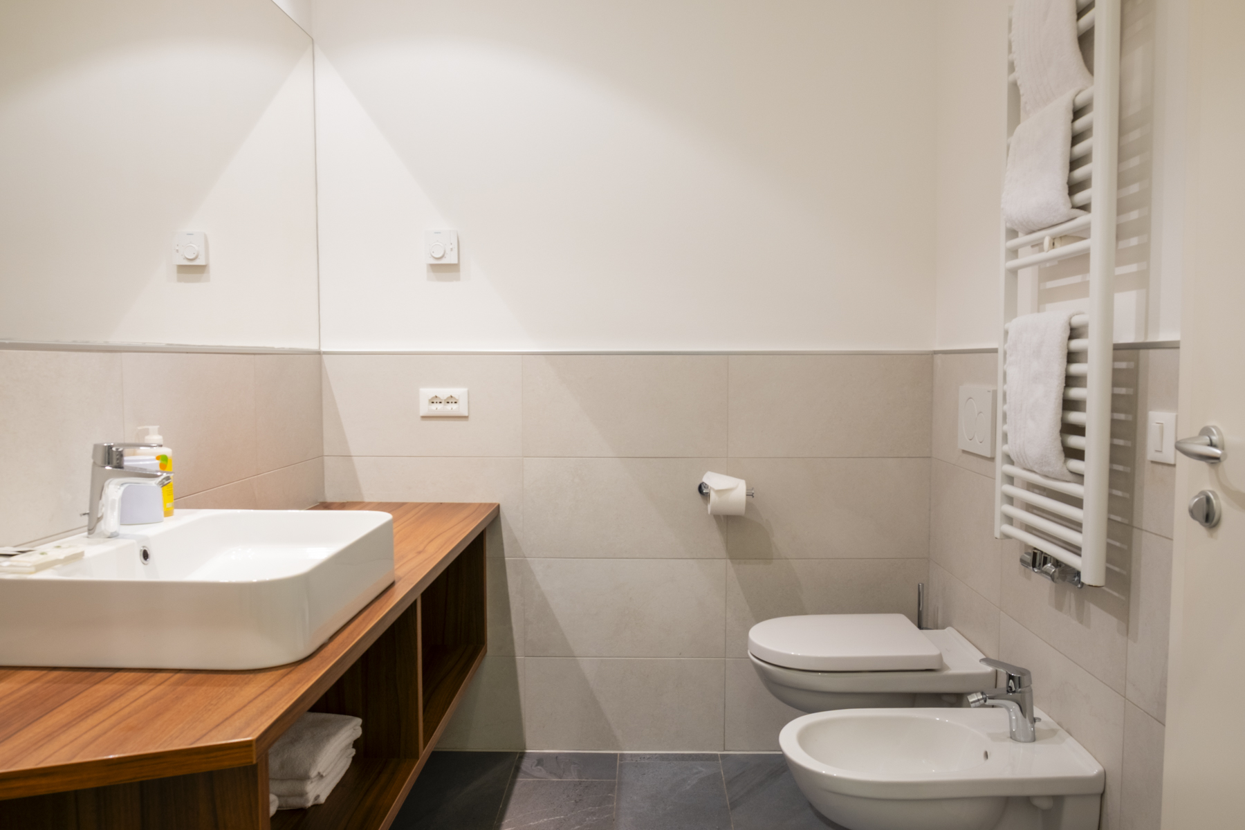 Il bagno è spazioso e dotato di ampia doccia, WC, asciugacapelli, lavandino con piano d’appoggio e finestra.