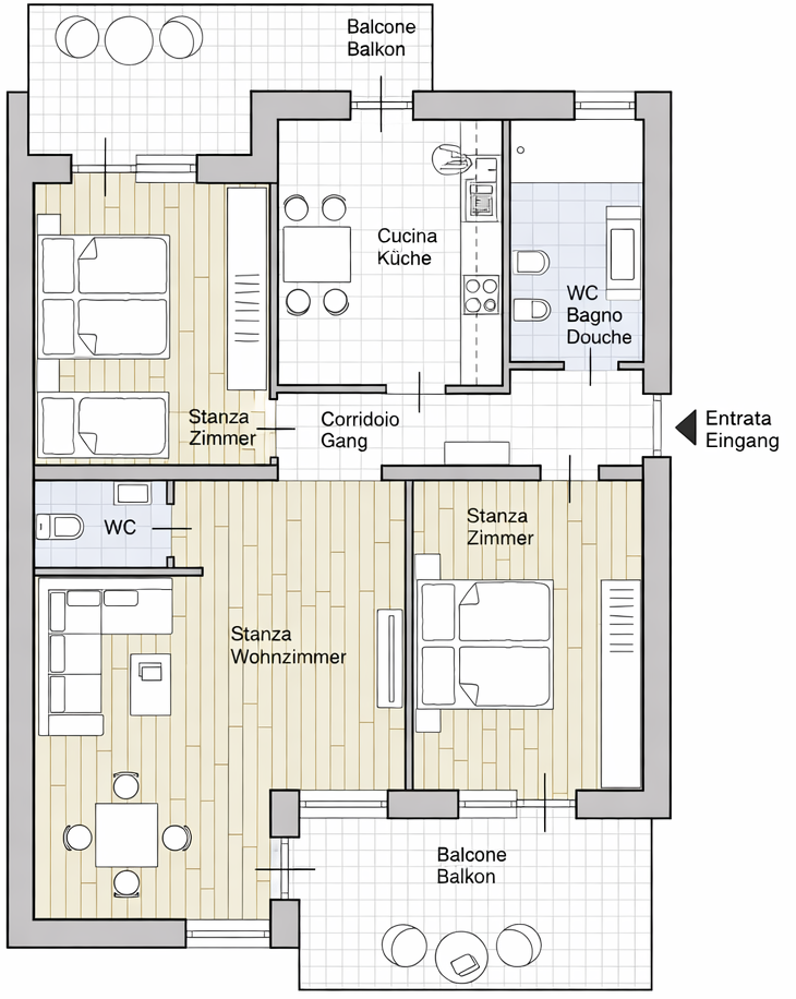 Questo elegante appartamento vanta pavimenti in pregiato parquet di rovere e un arredamento moderno e confortevole.